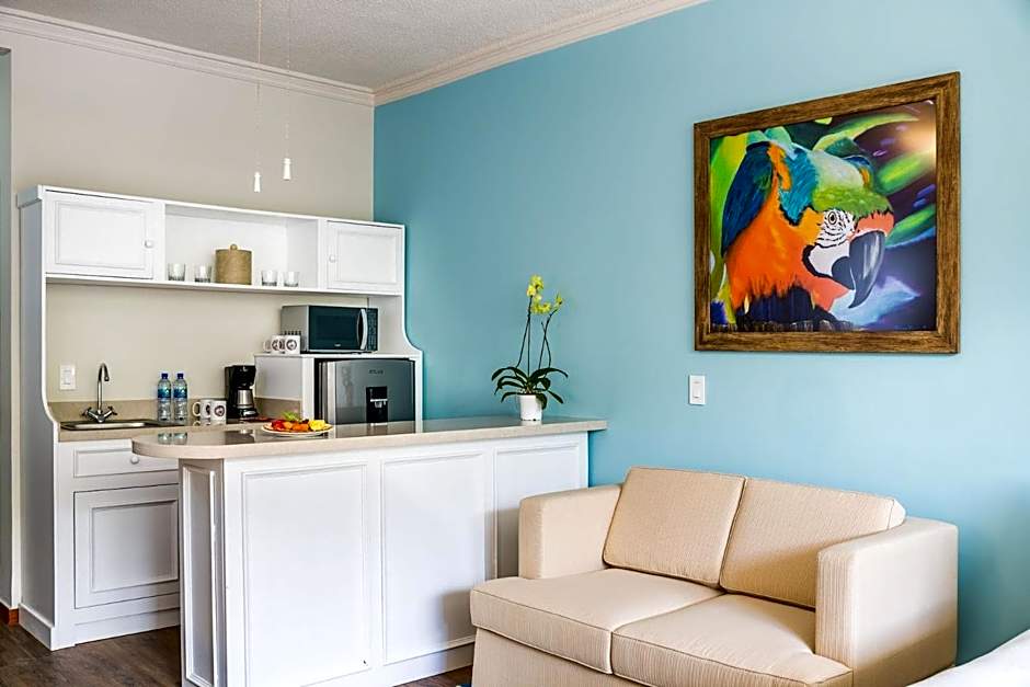 Mi casa es su casa, and this expansive 450 Sq. Ft Studio is the ideal setting for a family getaway. Fully appointed to function as a home away from home, this studio room features a small kitchenette with microwave, fridge, sink/wet bar and utensils where you can prepare easy snacks and beverages. Perfect for larger parties, the two Full Size beds made up with luxury linens, and a Full Size pull-out sleeper sofa will sleep 4 adults or 2 adults and up to 4 kids. A fully stocked bathroom includes a shower and tub and branded Margaritaville bath amenities.